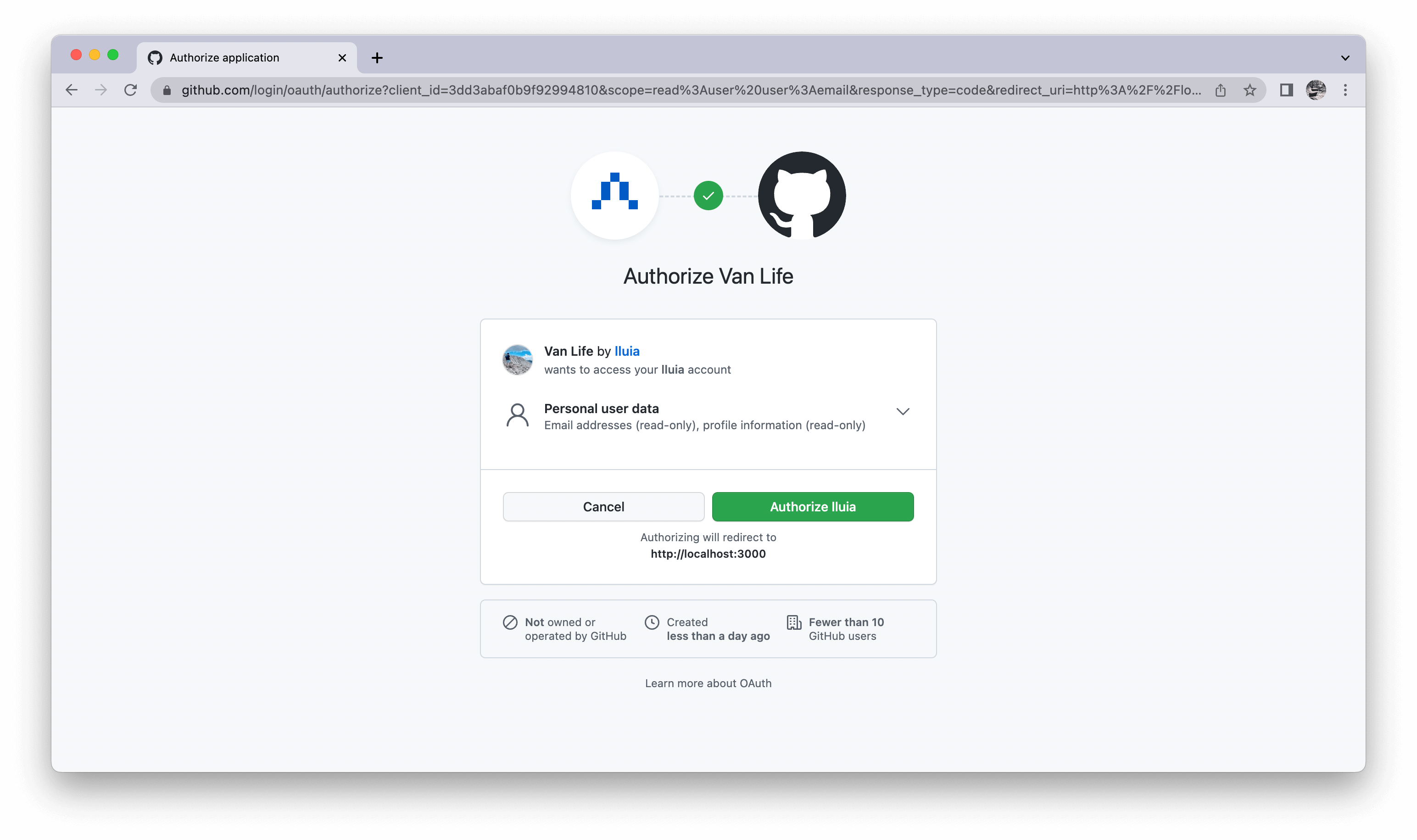 Once inserted and correct, GitHub will redirect the user to our app and NextAuth.js will take care of any further calls with GitHub to get access to the user profile and start a user session safely in the background: